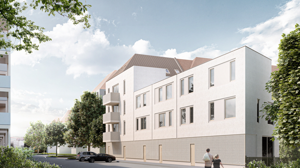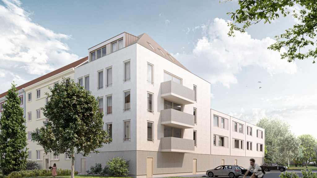 Das Mehrfamilienhaus wir in Massivbauweise ohne Keller errichtet und dem Effizienzhaus-Standard KfW 55 entsprechen. Die Materialität und Farbgestaltung der Fassade wurde in Abstimmung mit dem Denkmalamt gewählt, damit sich der Neubau harmonisch in das Viertel einfügt.