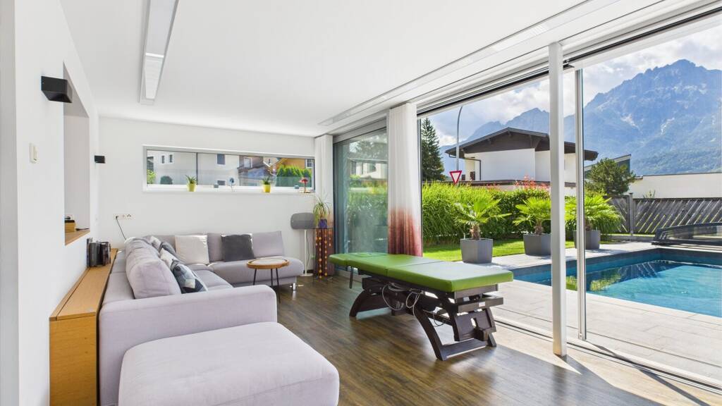 Bereits beim Betreten des Hauses spürt man: Hier wurde mit Liebe zum Detail geplant und hochwertig umgesetzt. Der lichtdurchflutete Wohn- und Essbereich mit Wintergarten (ca. 48 m²) bietet einen traumhaften Blick ins Grüne und direkten Zugang zur sonnigen Terrasse sowie dem überdachten Swimmingpool (7 m x 3,5 m) - perfekt für entspannte Sommertage.