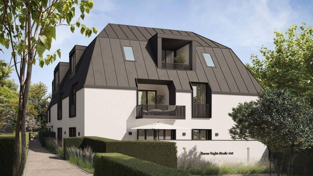 ARCHITEKTUR: - Traditionelle Gebäudeform mit individuellem Mansarddach - Wechselspiel aus heller Putzfassade und zeitgemäßen Elementen - Falzdach, Gauben sowie Metallelemente in dunklem Braunton, wie vorbewittertes Kupfer
