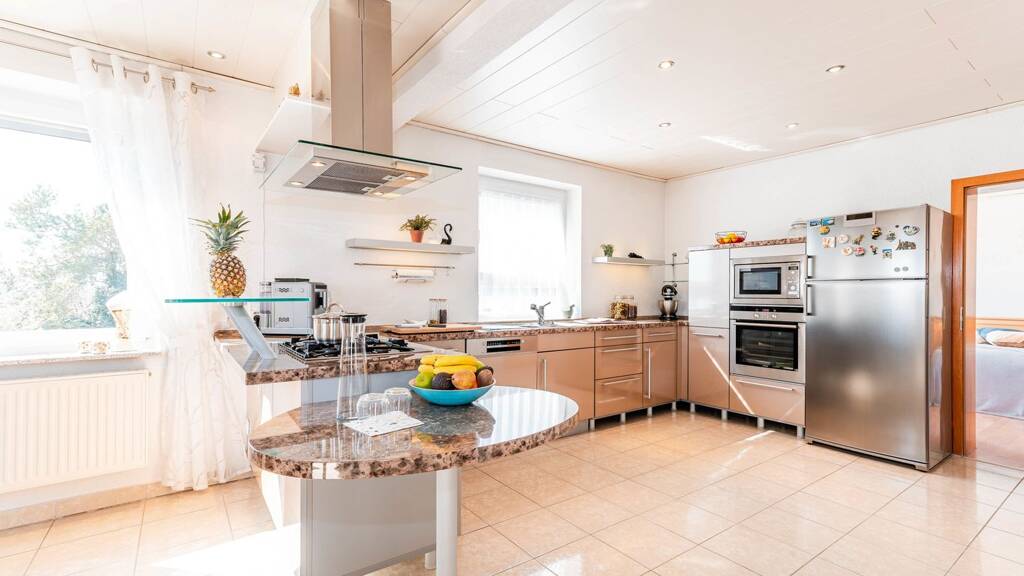 Im Inneren stehen insgesamt sieben Zimmer zur Verfügung, darunter fünf gut geschnittene Schlafzimmer sowie drei modern ausgestattete Badezimmer. Die Wohnbereiche sind offen gestaltet und verfügen über integrierte Küchenlösungen, die den Alltag erleichtern und gleichzeitig kommunikative Treffpunkte schaffen. Die gewählten Materialien wie Laminat und Fliesen sorgen für eine pflegeleichte und gleichzeitig ansprechende Wohnbasis.