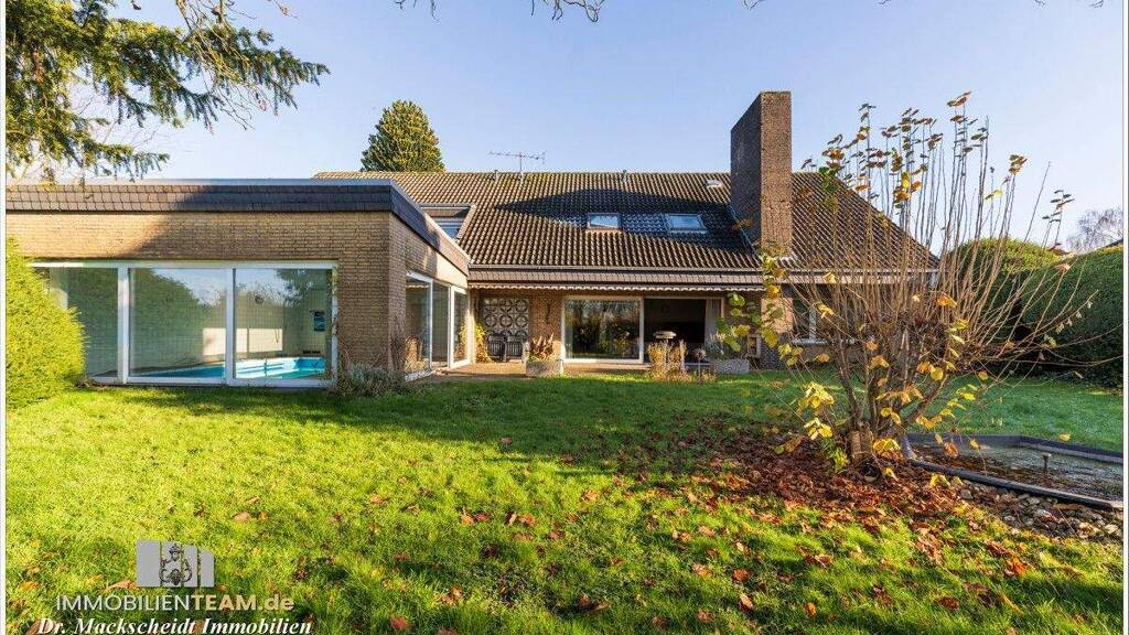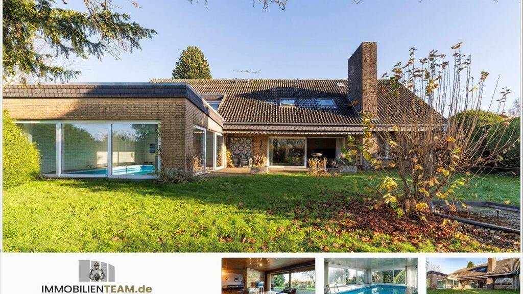 Heute wie damals besticht das Haus durch reichlich Platz fûr Familienträume infolge einer lichten, offenen Grundrissgestaltung mit breiten Fensterelementen, einer Loggia und einem Indoorschwimmbad mit bodentiefen Fensterflächen und Rundumgrünblick. Eine Wohnküche, ein Kamin, drei Bäder, eine Vollunterkellerung und zwei Garagen machen ihr neues Zuhause alltagskomfortabel.