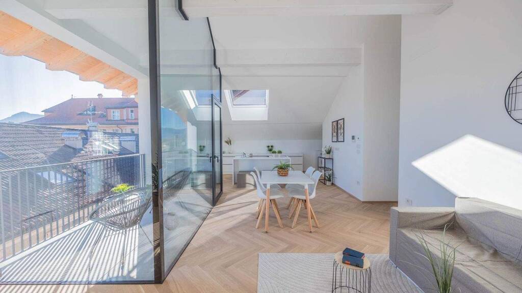 In absoluter Bestlage im Zentrum von Kaltern präsentiert sich diese exklusive Penthousewohnung, die die gesamte oberste Etage eines stilvoll sanierten Gebäudes einnimmt. Bereits beim Betreten wird klar, dass hier besonderes Augenmerk auf jedes Detail gelegt wurde: Edles Fischgrätparkett, großflächige Fliesen und perfekt abgestimmte Materialien schaffen eine außergewöhnlich elegante Atmosphäre. Die Etage wurde vollständig neu errichtet – inklusive Decken, Wänden und Dach – und erfüllt höchste Ansprüche an moderner, hochwertiger Wohnqualität.