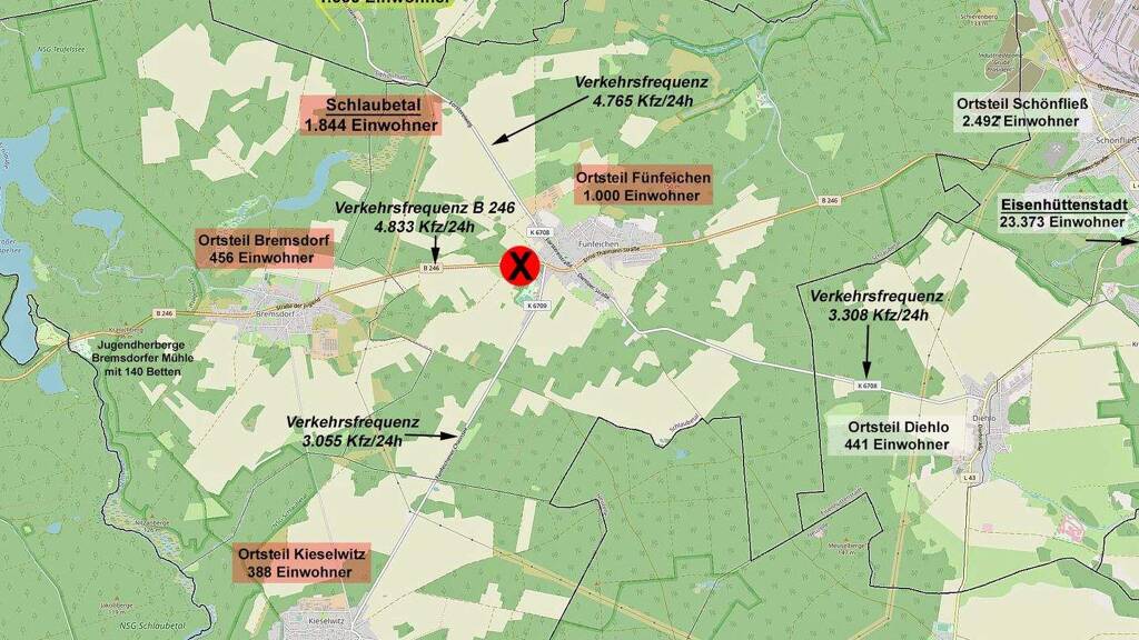 Der Standort befindet sich als neues Nahversorgungszentrum im Schlaubetal OT Fünfeichen und grenzt direkt an die Bundesstraßen B 246 mit zwei Zufahrten.