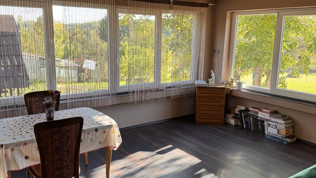 Das massive, aus Ziegeln gebaute Familienhaus steht auf einem Betonsockel und hat ein Dach aus Ziegeln. In den vergangenen Jahren wurden folgende Renovierungen durchgeführt: - Austausch aller Außen- und Innentüren - Zentrale Heizungsanlage mit Heizkörpern, einem Festbrennstoffkessel und einem 1000-Liter-Pufferspeicher - Ein indirekter Elektroboiler versorgt mit Warmwasser - Die Elektroinstallation ist brandneu und die Einspeisung wurde auf 3x20 A erweitert Die erneuerten Inneneinrichtungen und Beläge zeugen vom ausgezeichneten Geschmack des Eigentümers. Die Immobilie verfügt nicht über eine Kanalisation; das Abwasser wird durch eine biologische Kläranlage gereinigt, sodass keine Absaugung erforderlich ist. Der große Regenwassertank hilft bei der Bewässerung des Gartens, der viele Obstbäume beherbergt.