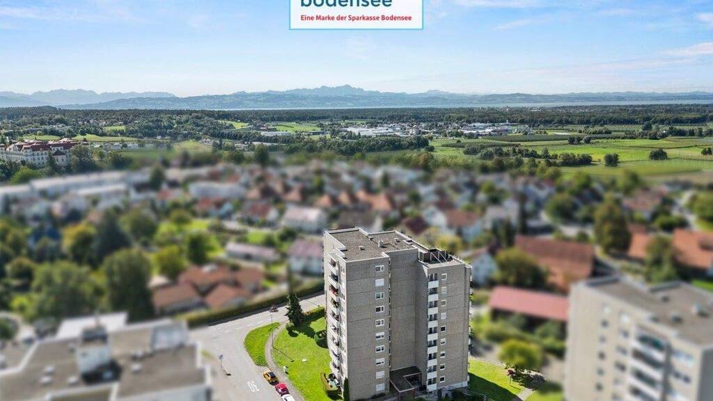 Das helle Wohnzimmer öffnet sich zu einem nach Westen ausgerichteten Balkon - hier genießen Sie einen traumhaften Panoramablick auf den Bodensee und die Berge sowie viele sonnige Stunden.