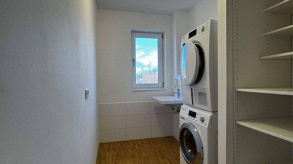 Ein separater Hauswirtschaftsraum (ca. 6 m²) mit Fenster bietet Anschlüsse für Waschmaschine und Wäschetrockner, ein Waschbecken, Regale sowie Beleuchtung und ist ebenfalls mit Fußbodenheizung ausgestattet.