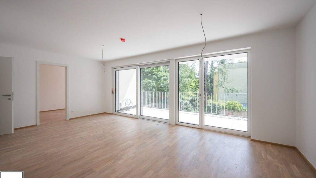Über den Vorraum, mit ausreichend Platz für eine Garderobe, erreichen Sie das separate WC mit Handwaschbecken, den praktischen Abstellraum, sowie die Wohnküche mit einer Größe von rd. 31m2 mit herrlichem Grünblick. Die vollausgestattete Küche befindet sich idealerweise in einem Eck und liegt somit optisch vom Wohnraum getrennt. Über das Wohnzimmer ist das rd. 14m2 große Schlafzimmer begehbar und weiters über einen kleinen, weiterführenden Flur das zweite Schlafzimmer (rd. 12m2), sowie das Badezimmer mit Dusche, Doppelwaschbecken und Waschmaschinen-Anschluss. Der rd. 14m2 große Balkon lädt zum Entspannen und Verweilen ein und verfügt über einen Wasseranschluss. Aufgrund der ost-/südseitigen Ausrichtung ist die Erdgeschosswohnung ganztägig hell. Ein der Wohnung zugeordnetes Kellerabteil rundet das Angebot perfekt ab.