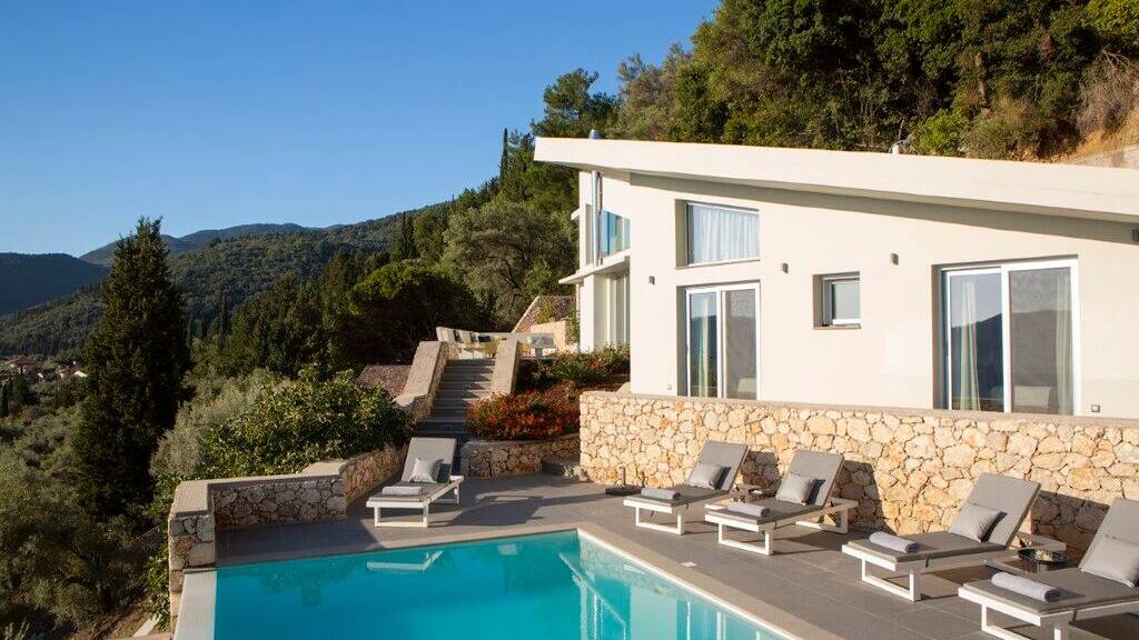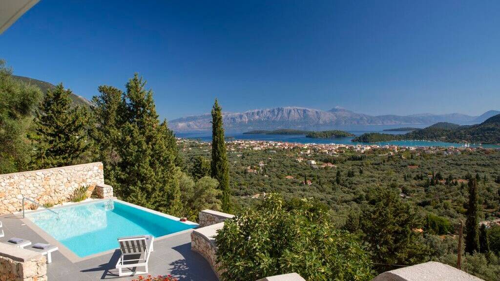 Immobilienübersicht- Lage: Nur 1,3 km vom Zentrum von Nydri und 350 Meter von Paliokatouna entfernt, eingebettet in üppige Olivenhaine und mediterrane Gärten. Genießen Sie Panoramablick auf die umliegenden Inseln von Lefkas und das Festland.