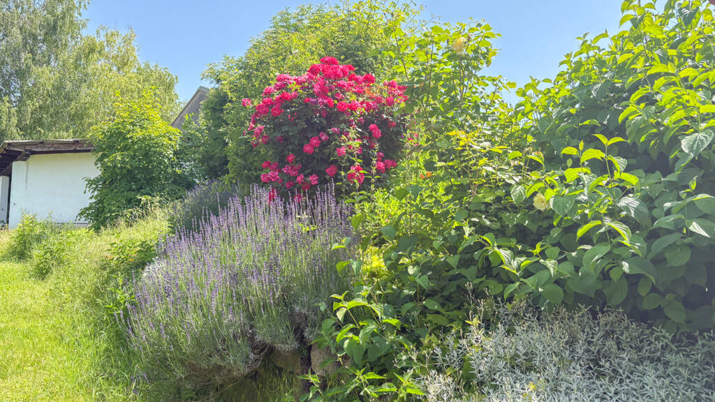 Der große, liebevoll gepflegte Garten ist mit Obstbäumen und Sträuchern bepflanzt und verfügt über eine Bewässerungsanlage. Ebenso finden sich hier diverse Nebengebäude wie Stall und Schuppen, aber auch ein Presshaus mit Gewölbekeller.