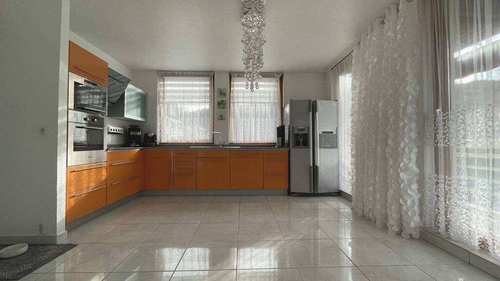 Zur Ausstattung gehören außerdem eine moderne Einbauküche, pflegeleichte Fliesen- und Laminatböden sowie doppelverglaste Holzfenster.