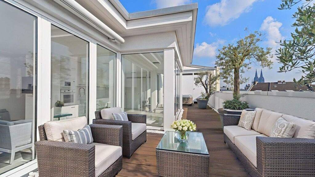 Das wahre Highlight dieser Immobilie offenbart sich auf der nach Süden ausgerichteten ca. 41,8 m² großen Dachterrasse inklusive eines ca. 4,9 m² großen, abgetrennten Abstellraums mit Bankirai-Holzbelag. Dieser private und uneinsehbare Rückzugsort eröffnet einen spektakulären Panoramablick über Köln - vom Dom bis hin zum Fernsehturm. Ein repräsentativer Jacuzzi lädt zum Entspannen ein und bietet pures Wellness-Feeling über den Dächern der Stadt. Darüber hinaus bietet die großzügige Terrasse die Möglichkeit, eine Sauna zu integrieren und diesen Außenbereich in ein privates Spa-Refugium zu verwandeln. Drei hochgewachsene Olivenbäume sorgen für ein mediterranes Flair. Für angenehmen Schatten an warmen Tagen sorgt eine elektrisch ausfahrbare Markise.