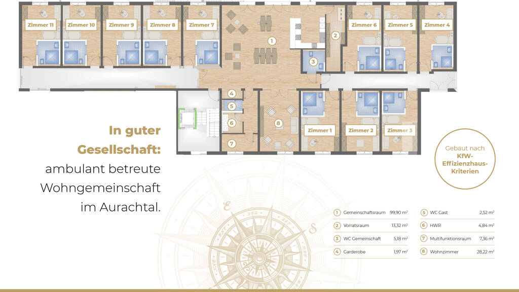 Wir freuen uns, Ihnen unseren Neubau einer ambulant betreuten Wohngemeinschaft (Senioren-WG) mit 11 Wohneinheiten (Bewohnerzimmern) vorzustellen. Diese Wohngemeinschaft bietet ein Rund-um-die-Uhr-Betreuungskonzept in einem modernen und komfortablen Umfeld, ideal für Senioren, die selbstbestimmt leben möchten und gleichzeitig auf Unterstützung nicht verzichten wollen.