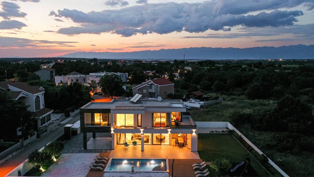 Diese elegante Villa vereint klare Architektur mit mediterraner Leichtigkeit in ruhiger Lage nahe Zadar. Auf einem 854 m² großen Grundstück bietet sie 158,8 m² Wohnfläche auf zwei Ebenen sowie drei Terrassen, davon zwei überdacht, und einen stilvoll gestalteten Außenbereich.