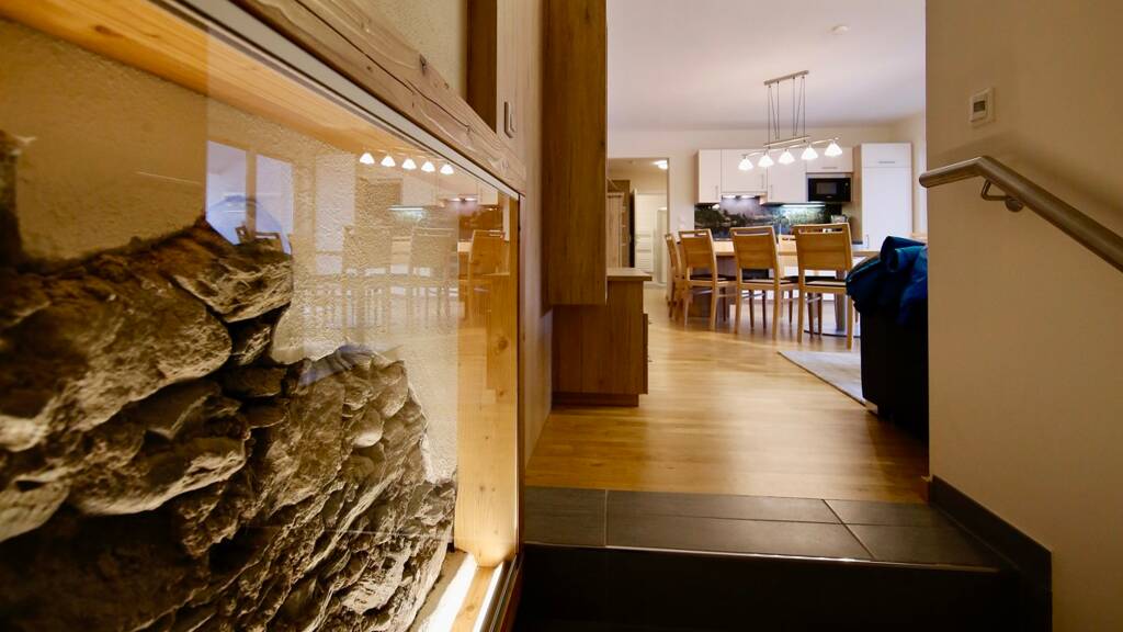 Authentische Materialien: Die Mischung aus Holz und Stein verleiht der Wohnung alpinen Charme mit modernem Flair.