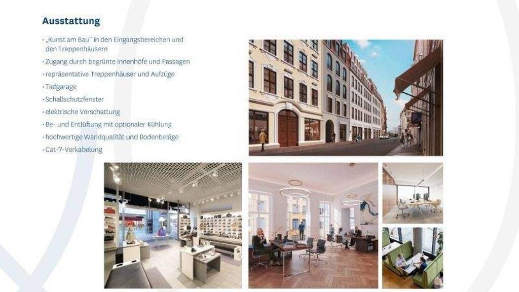 - repräsentativer Eingangsbereich mit künstlerischer Gestaltung - große, bodentiefe Fenster im Erdgeschoss - Zugang durch begrünte Innenhöhe und Passagen - repräsentative Treppenhäuser und Aufzüge - Tiefgarage - Schallschutzfenster - elektrische Verschattung - Be- und Entlüftung mit optiionaler Kühlung - hochwertige Wandqualität und Bodenbeläge - Cat-7-Verkabelung