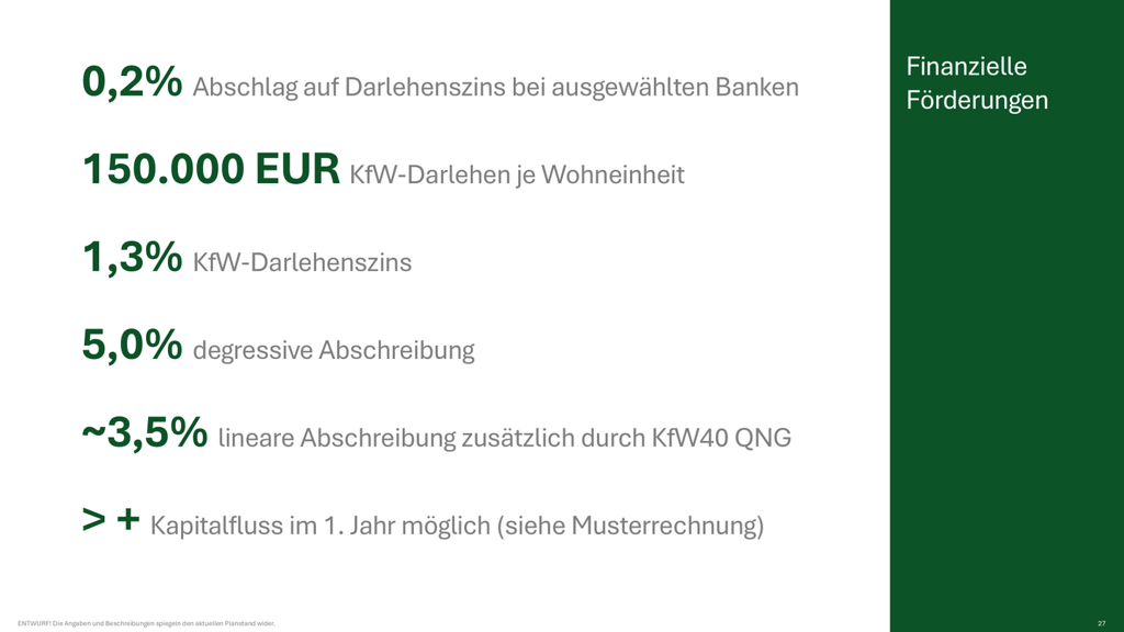 Ebenso können Kapitalanleger dadurch neben der 5%-igen degressiven Abschreibung aus dem Wachstumschancengesetz auch für 4 Jahre die zusätzliche Abschreibung in Höhe von 5% für den QNG Standard (max. 4.000 EUR/qm), * im vorliegenden Fall ca. 3,5% p.a., in Anspruch nehmen.