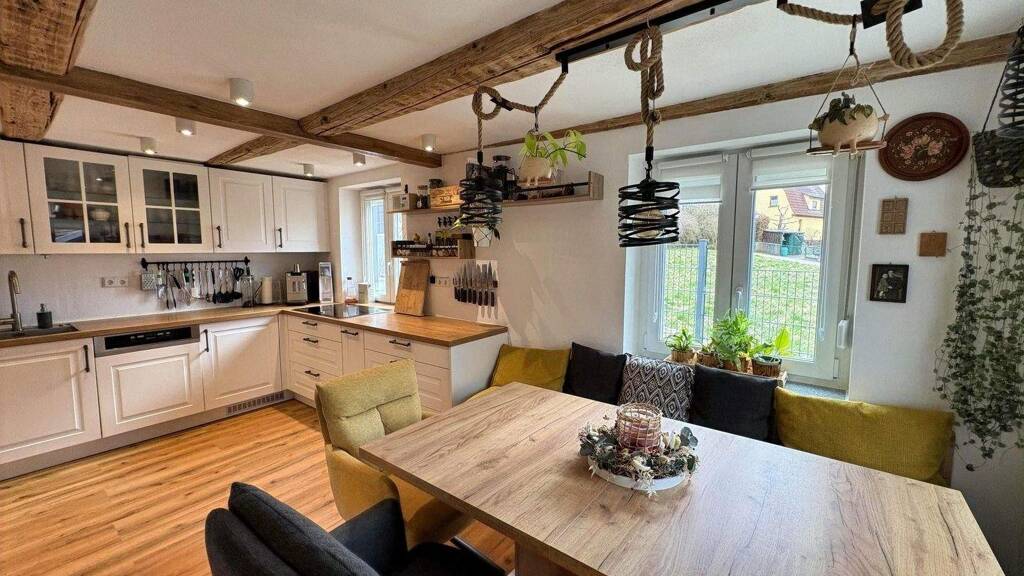 Modernisierungen im Überblick im Jahr 2022: - Dämmung der Zwischendecke mit Hanfdämmwolle - neue, energieeffiziente Fenster mit Rolladen und Türen - hochwertige Einbauküche - neue Bodenbeläge in allen Wohnräumen mit hochwertigem SPC Vinyl - Erneuerung der Elektrik - Austausch der Wasserleitungen - Installation eines Pelletofens und eines Schwedenofens - Umgestaltung und Modernisierung des Badezimmers - Installation einer Enthärtungsanlage - Einbau Wildeichenholztreppe - Erneuerung Warmwasserboiler (Küche) und Durchlauferhitzer (Bad) - Anstrich Außenfassade - Begradigung und Umgestaltung des Gartens mit Granitstufen