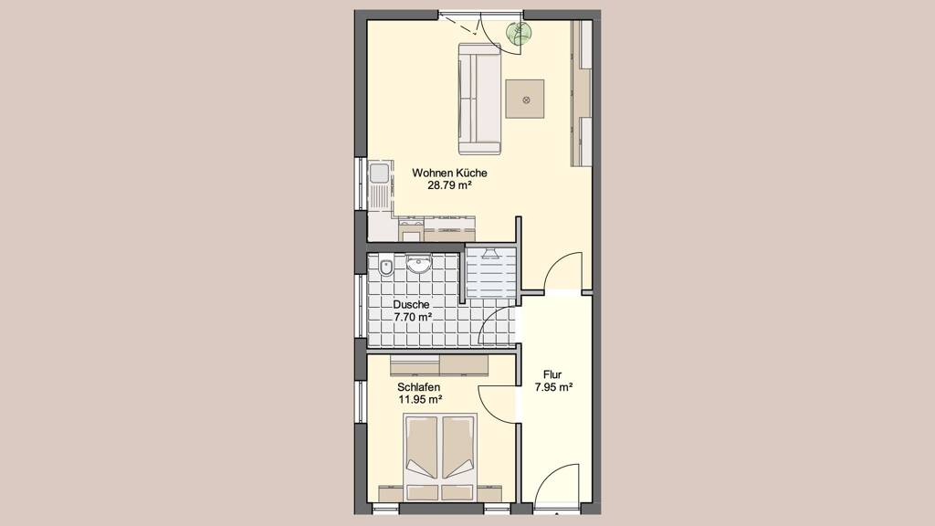 oder entspannte Stunden ist. Die integrierte Küche sorgt für eine offene und einladende Atmosphäre. Das Duschbad ist mit 8 m² großzügig gestaltet.