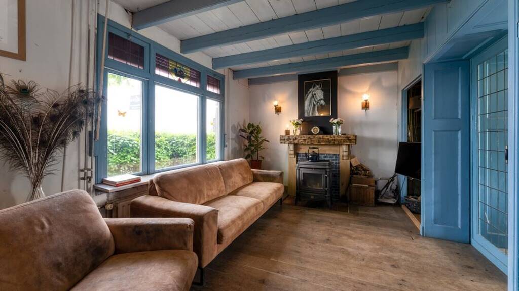 Wohnzimmer Durch den grünen und gemütlichen Vorgarten betritt man das Haus. Die Eingangshalle bietet Zugang zum Wohnzimmer und einem zusätzlichen Raum. Zurzeit ist dieses Zimmer als Büro eingerichtet. Auf der linken Seite des Hauses befindet sich das Wohnzimmer. Es ist ein schöner, heller und gemütlicher Raum, der einen Blick auf das Ackerland an der Vorderseite bietet. Durch die authentischen Schiebetüren gelangt man in die halboffene Küche und in den Essbereich.