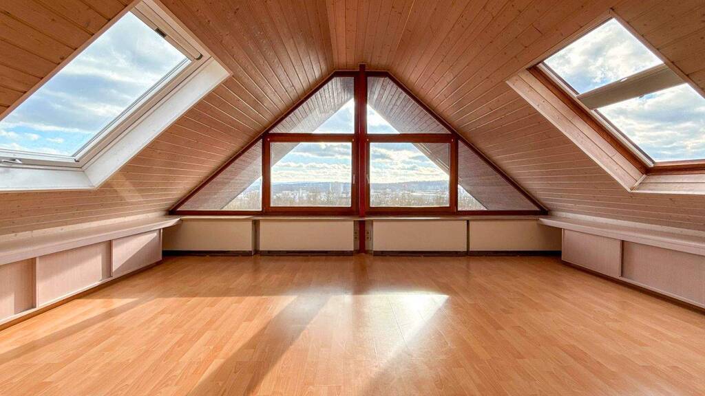 Ein besonderes Highlight ist das lichtdurchflutete Dachgeschoss: Die großzügige Glasfront eröffnet einen beeindruckenden Weitblick und schafft eine helle, freundliche Atmosphäre – perfekt als Rückzugsort zum Entspannen oder als inspirierender Arbeitsplatz.