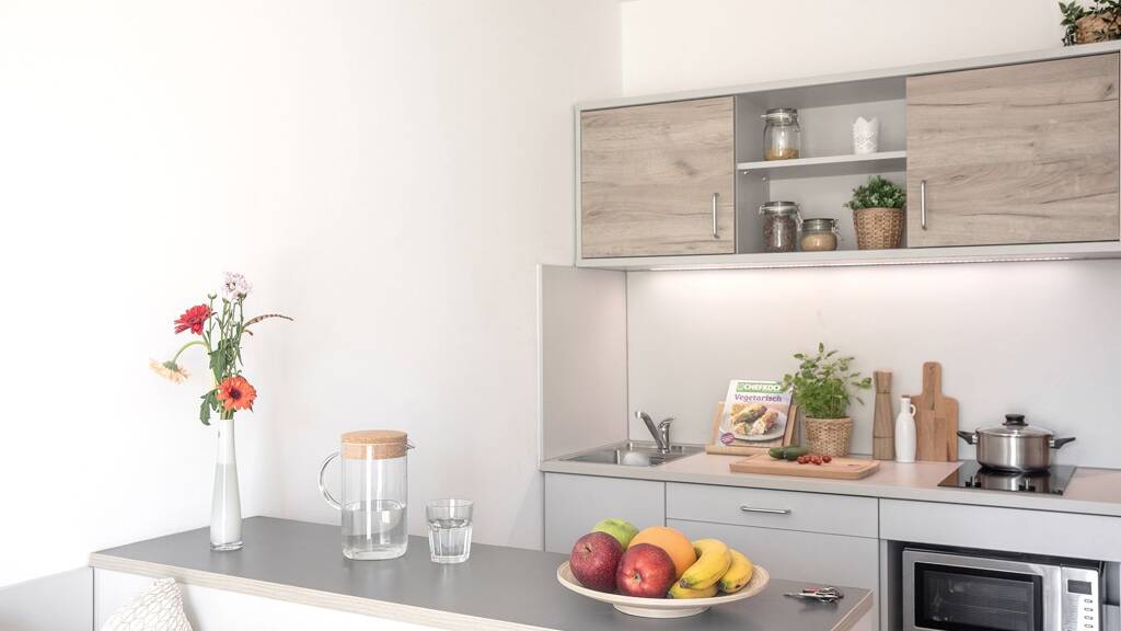 • Living and working area: bed incl. mattress, desk with chair, wardrobe with mirror, lightproof curtains, intercom and generally extra storage space