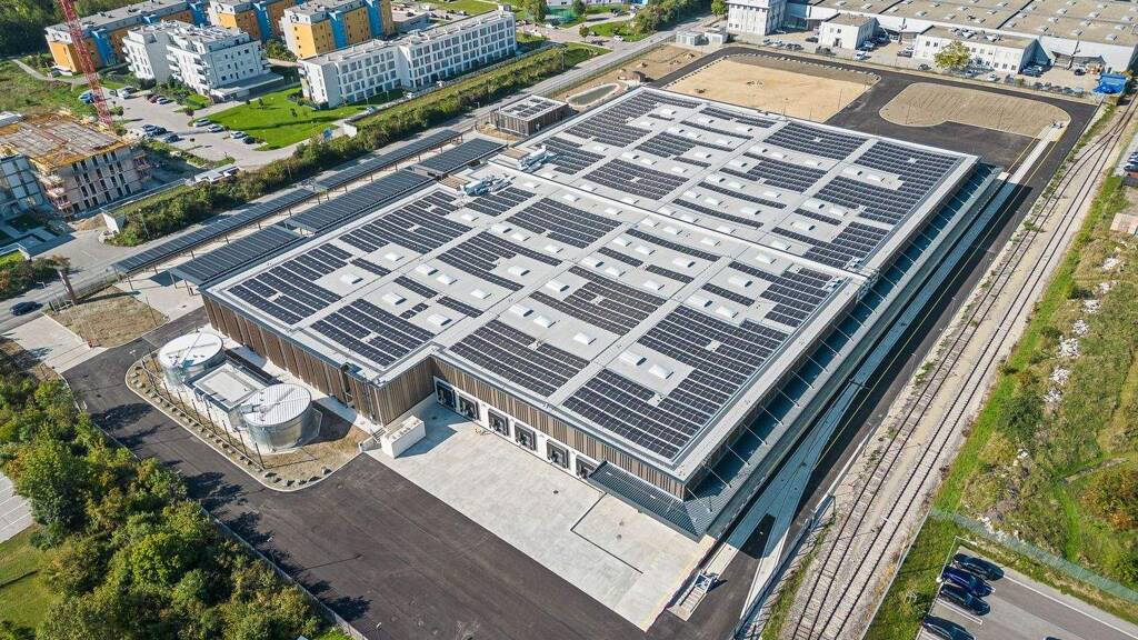 Schon der Außenbereich der Liegenschaft spiegelt den Fokus auf das Thema Nachhaltigkeit innerhalb des Projektes wider. Photovoltaik, Geothermie, Netzersatzbetrieb Büros und E-Ladeinfrastruktur für Sprinter, PKW und Fahrräder sind hier nur einige der Ausstattungselemente.