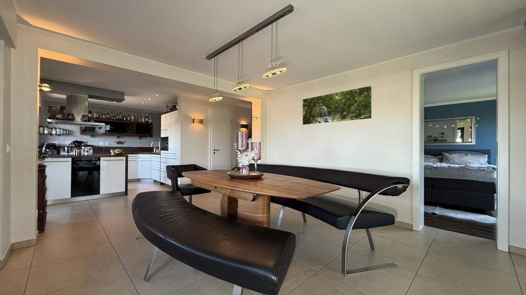 Die Eigentümerwohnung (rechte Haushälfte): Diese Wohneinheit beeindruckt durch Großzügigkeit und Design: Im Erdgeschoss lädt ein weitläufiger Essbereich mit offener Küche zum Leben und Genießen ein. Ein Schlafzimmer, ein hochwertiges Badezimmer mit bodengleicher Dusche, Badewanne und Doppelwaschtisch sowie ein praktischer Abstellraum ergänzen die Etage. Der Zugang zur großen Terrasse und dem liebevoll gepflegten Garten erfolgt direkt vom Küchenbereich aus. Highlight hier: Ein ausgebautes Gartenhaus mit Barbereich und zusätzlichem Geräteschuppen.