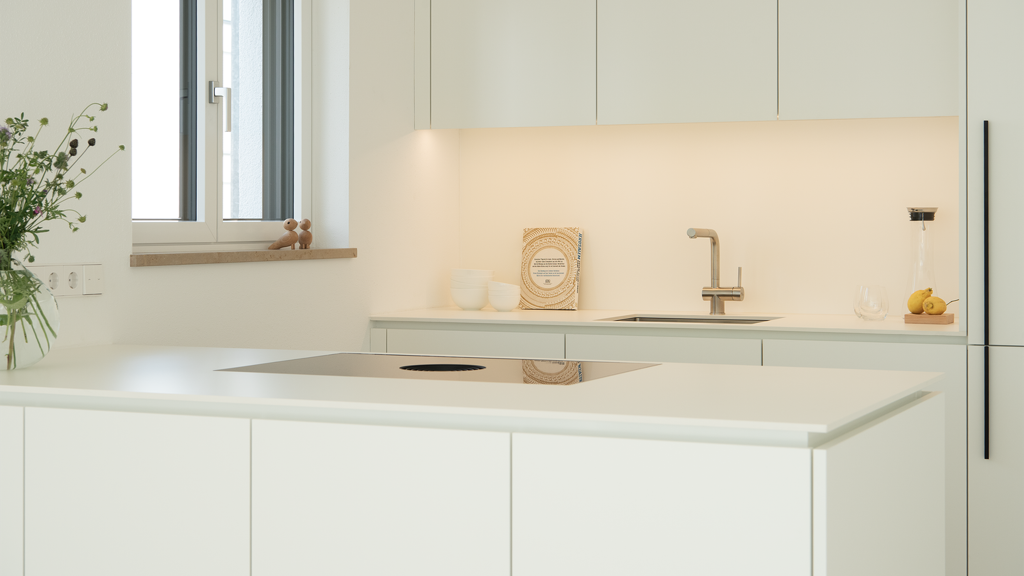 Über einen Windfang erreicht man zum einen den großzügig konzipierten Empfangsbereich des Hauses und zum anderen eine etwa 33 qm große Gästewohnung mit eigenem kleinem Duschbad. Die Gästewohnung ist hell und freundlich gestaltet und erstreckt sich über 2 Etagen, welche durch eine innenliegende Treppe verbunden sind. Der Empfangsbereich des Hauses bietet Platz für eine großzügige Garderobe und führt uns direkt in den lichtdurchfluteten Koch-, Ess- und Wohnbereich mit einer riesigen Hebe-Schiebe-Tür sowie zu einem separatem Gäste-WC und einem kleinen Abstellraum. Über die halb gewendelte Treppe mit Massivholzstufen aus gebürsteter Eiche und filigranem schwarzen Eisenstäben erreicht man das Obergeschoss, was sich in drei helle Räume, einem Badezimmer mit Fenster und einem Ankleidezimmer gliedert. Die Räume sind wahlweise als Schlaf- oder Kinderzimmer oder als Büro nutzbar. Das Badezimmer hat eine warme Atmosphäre und ist mit einer halb freistehenden Badewanne, einer großzügigen Echtglas-Dusche sowie zwei Waschtischen und einem WC ausgestattet. Ein absoluter Wohntraum ist das geräumige Studio im Dachgeschoss mit viel Tageslicht und einem Weitblick bis über die Felder der Umgebung. Aber auch im Untergeschoss hört der Luxus nicht auf. Neben dem Schlafbereich der Gästewohnung finden wir hier auch einen rund 23 qm großen Fitnessraum. Auch diese beiden Räume verfügen über viel Tageslicht, welches durch große Lichthöfe mit begehbaren Glasabdeckungen sichergestellt ist.