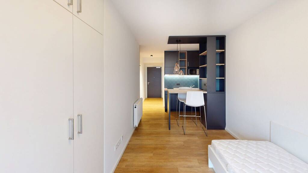 Der helle Wohn- und Schlafbereich überzeugt durch eine effiziente Raumaufteilung und bietet Platz zum Wohnen, Arbeiten und Entspannen. Große Fensterflächen sorgen für eine freundliche, lichtdurchflutete Atmosphäre.