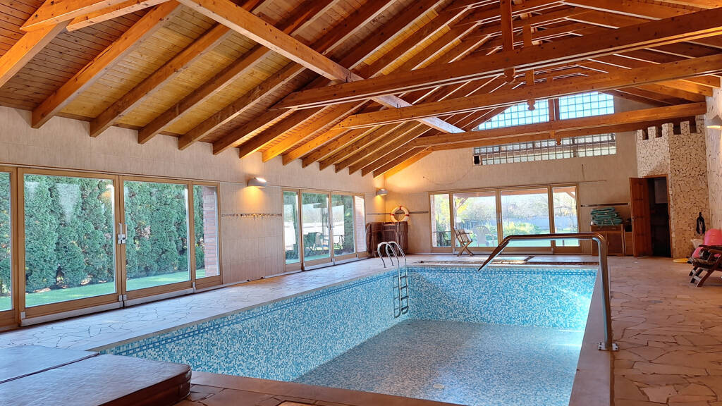 Der beeindruckende 160 m2 große Wellnessbereich ist schwer in Worte zu fassen: ein schöner Terrassenraum mit Schiebetüren mit Panoramablick auf den Garten rundherum, Teeküche, Bad, Waschbecken, Infra- und Finnische Sauna. Der Pool hat Mosaikfliesen, eine Gegenstromdusche, eine Schultermassage und kann beheizt werden. All dies wird durch einen versenkten Whirlpool für 6 Personen ergänzt.