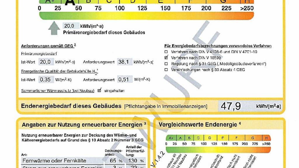 Energieausweis: Bedarfsausweis gültig von: 07.01.2025 Endenergiebedarf Wärme: 47 kWh/(m²a) inklusive Warmwasser Wesentliche Energieträger Heizung: Befeuerung Fernwärme Energieeffizienzklasse: A Baujahr: 2024
