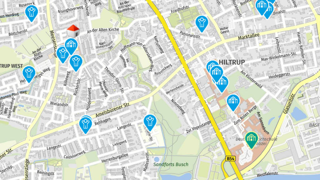 Im direkten Umfeld oder auf Hiltrups Haupteinkaufsstraße, der Marktallee, finden Sie ebenfalls alles für den täglichen Bedarf und ein ausreichendes Ärzteangebot. Das Hallenbad, ein großes beliebtes Freibad, die Stadthalle und vielfältige Sportmöglichkeiten sind weitere Gründe, warum dieser Stadtteil so beliebt ist. Die nahen Waldgebiete und der Dortmund-Ems-Kanal bieten außerdem attraktive Erholungsmöglichkeiten.