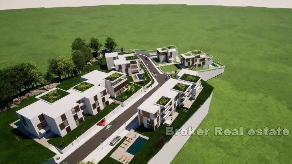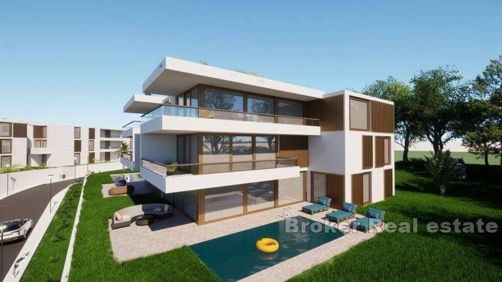 Wohnungen zum Verkauf im Erdgeschoss und im ersten Stock mit Swimmingpool und Garage. Wohnungen mit einer Nutzwohnfläche von 116 m2 bestehen aus drei Schlafzimmern und zwei Bädern, einer Küche, einem Esszimmer, einem Wohnzimmer und einer großzügigen Terrasse von 22 m2.