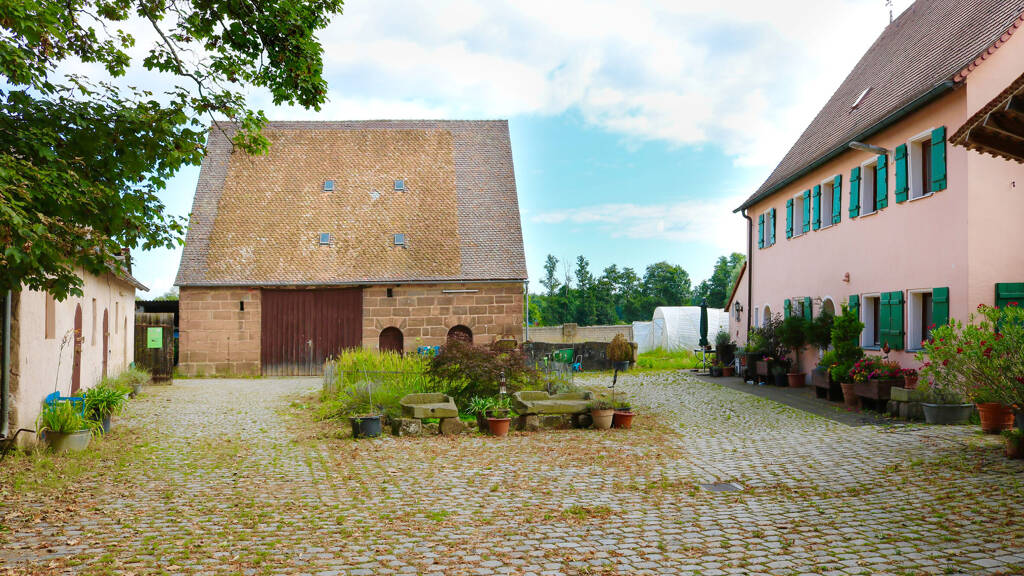 Hofanlage; Wohnhaus, zweigeschossiger Putzbau mit Satteldach, 17./18. Jh.; Scheune, eingeschossiger Sandsteinquaderbau mit Satteldach, 17./18. Jh.; Stall, eingeschossiger verputzter Sandsteinbau mit Satteldach und Aufzugsgaube, 17./18. Jh.; Backofen, kleiner Sandsteinquaderbau mit Satteldach, bez. 1694; überdachte Hofeinfahrt mit Fußgängerpforte, verputzter Sandsteinquaderbau, 18. Jh.