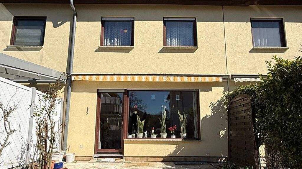 Das im Jahr 1990 erbaute Haus hat die klassische Aufteilung eines Reihenhauses. Über den Windfang, der ausreichend Platz für eine Garderobe und einen Schuhschrank bietet, gelangt man in einen weiteren Flur. Die Küche mit Einbauküche sowie das Gäste-WC schließen sich an diesen Flur an. Des Weiteren führt er in das große Wohn-Esszimmer mit der angrenzenden Terrasse und dem Garten. Die ruhig gelegene Terrasse ist mit einer Markise ausgestattet und ist gefliest, so dass man hier schöne Stunden in den Sommermonaten verbringen kann. Ein paar Stufen führen in den kleinen Garten mit Rasen und Beeten, wo sich Hobby-Gärtner austoben können.