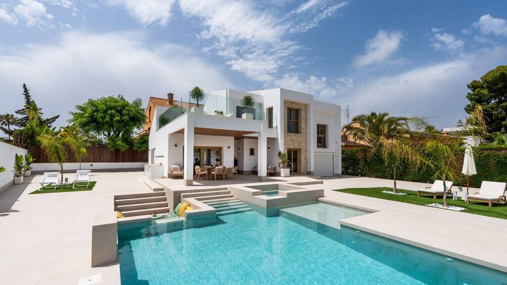 Die Immobilie verfügt über eine Klimaanlage, Küchengeräte von Bosch, eine Osmoseanlage in der Küche, Einbauschränke und elektrische Rollläden in allen Schlafzimmern, LED-Beleuchtung innen und außen, eine Video-Gegensprechanlage, einen Drei-Zonen-Salzwasser-Chlor-Pool mit Jacuzzi, einen Strandbereich und eine Vorinstallation für eine Wärmepumpe, eine Außenküche mit eingebautem Backofen/Mikrowelle, eine motorisierte Garage und ein Einfahrtstor sowie eine Steckdose in der Garage zum Aufladen von Elektroautos.