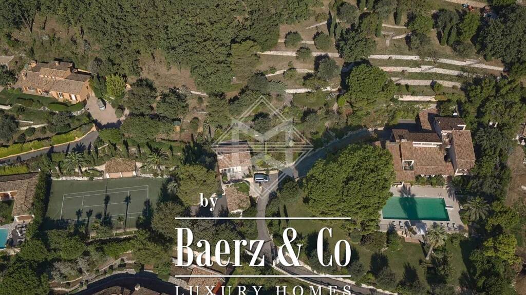 located in a commanding position on the heights of vence, this exceptional estate, designed by jean mus, offers breathtaking panoramic views from the mountains to the sea. with approximately 500 m² of living space, numerous terraces, and nearly 2 hectares of wooded grounds, it seamlessly combines luxury and tranquility. the main house features five spacious en-suite bedrooms. the generous living areas are perfect for relaxation and leisure, complemented by a separate, fully equipped kitchen and a mezzanine converted into a tv and games area. outside, there is a 22 x 8-meter swimming pool with a jacuzzi for unwinding, along with splendid views of the sea and garden. sports enthusiasts will appreciate the private tennis court and adjacent studio, complete with a shower room and bar. ornamental ponds add a touch of serenity to the surroundings. the property offers ample parking with two garages and covered parking for three additional vehicles. a covered area, currently equipped with a sauna and shower, can be converted into an apartment. a guest house includes two bedrooms, a bathroom, a kitchen, and a large terrace. a spacious workshop adjoins the garage below. conveniently located near the town center and just 20 minutes from nice airport.