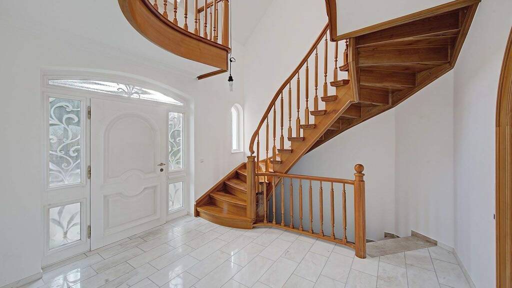 Die markante Edelholztreppe führt auf die obere Galerie. Hier liegen das Hauptschlafzimmer mit Zugang auf den Balkon und in das 2025 äußerst geschmackvolle wie luxuriöse Bad en Suite.