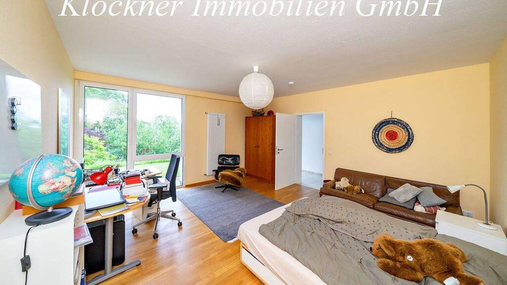 Die großzügigen hellen Räumlichkeiten erstrecken sich über 2 Etagen und ca. 350m³ Wohnfläche. Das EG umfasst den repräsentativen Wohn-Essbereich, eine geräumige Küche mit Speisekammer, ein Arbeitszimmer, die Bibliothek und das G-WC. An den Wohnbereich schließt sich eine große Terrasse mit Markise an, die den Blick in den parkartigen Garten gewährt.