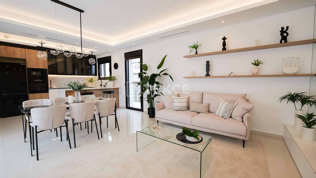 Die Innenräume sind auf einer Ebene verteilt und sowohl auf Funktionalität als auch auf Komfort ausgelegt. Diese Villen verfügen über drei geräumige Schlafzimmer mit Einbauschränken und zwei bis drei elegante Badezimmer mit hochwertiger Ausstattung. Der offene Wohn und Essbereich fügt sich nahtlos in die Küche ein und schafft einen geräumigen und hellen Mittelpunkt. Dank großer Glasschiebetüren wird der Wohnbereich von Tageslicht durchflutet und verbindet den Innenbereich mit den Außenterrassen, die sich perfekt für Unterhaltung oder Entspannung in absoluter Privatsphäre eignen.