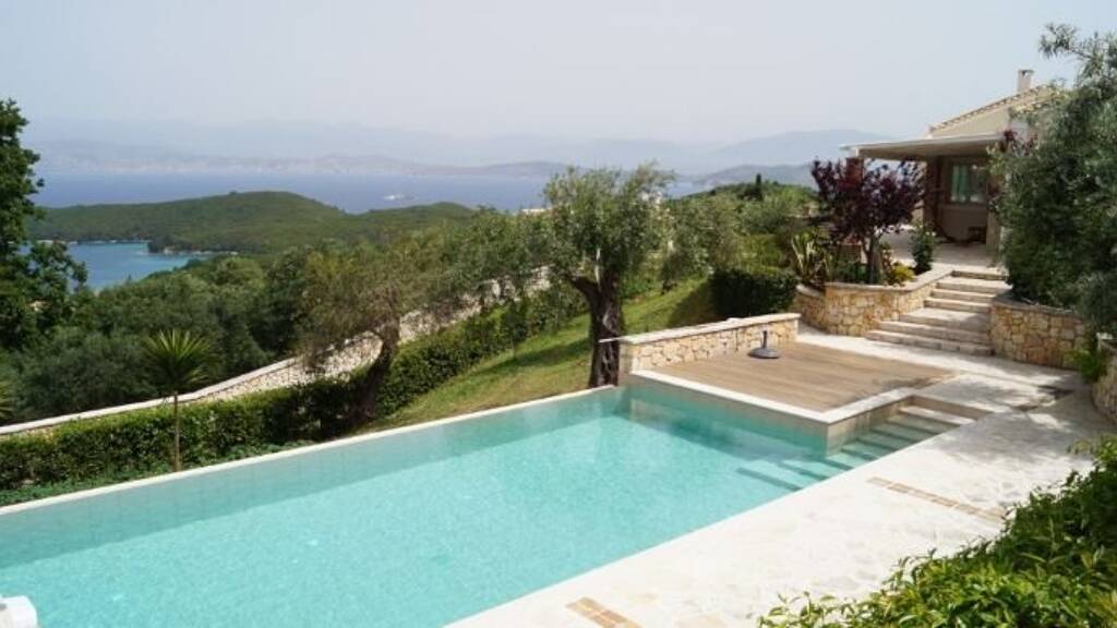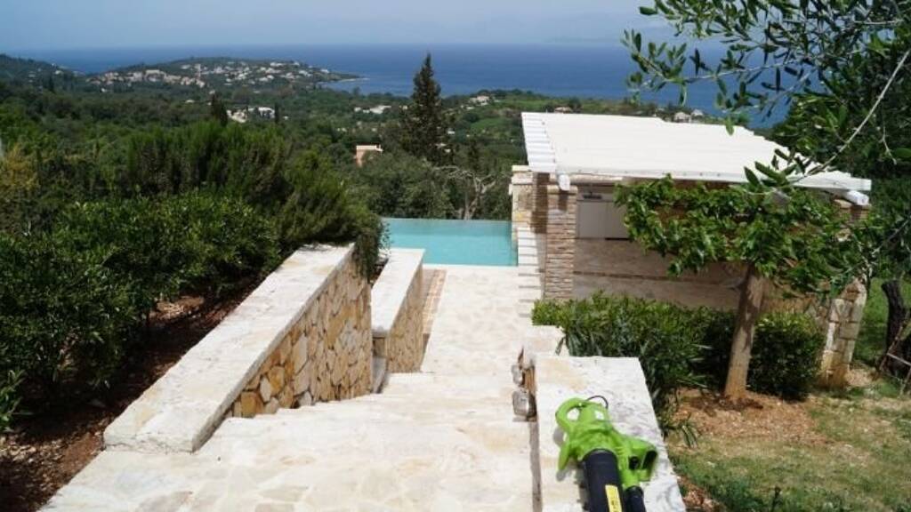 Vom üppigen Garten mit Bäumen und Blumen umgeben, bietet die Villa einen atemberaubenden Blick über die Bucht von Avlaki Bucht und das Ionische Meer.
