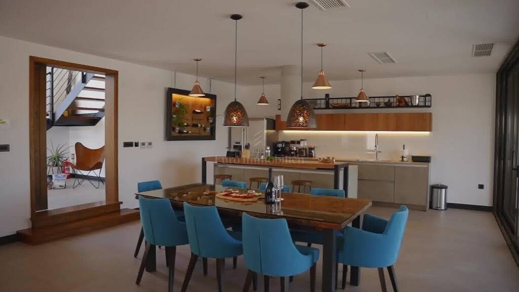Der Zugang zum Pool ist vom Wohnzimmer und dem Fitnessraum über die Terrasse möglich. Vom zweigeschossigen Eingangsbereich gelangt man über eine Innentreppe in die erste Etage. Die Villa verfügt über eine eingebaute Fußbodenheizung, Kanalklimaanlagen an der Decke, eine zentrale Wärmepumpe für Warmwasser, eine Solardusche im Freien, einen beheizten Pool von 32 m2 mit Wasserfall und Whirlpool sowie einen automatischen Poolmaschinenraum und einen Sommer Küche mit Kamin, Solarkraftwerk 8,3 kW, Videoüberwachung, Einbruchschutzsystem und Gegensprechanlage.