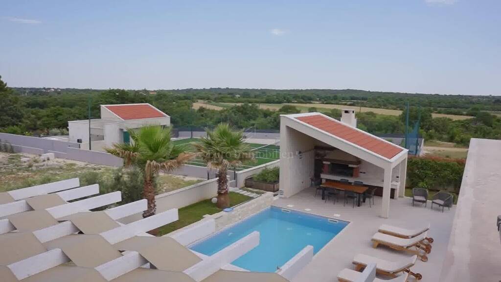 Zum Verkauf steht eine luxuriöse Villa mit Swimmingpool, Nebengebäude und Sportplätze in ruhiger Lage in Poljica-Brig in Zadar.
