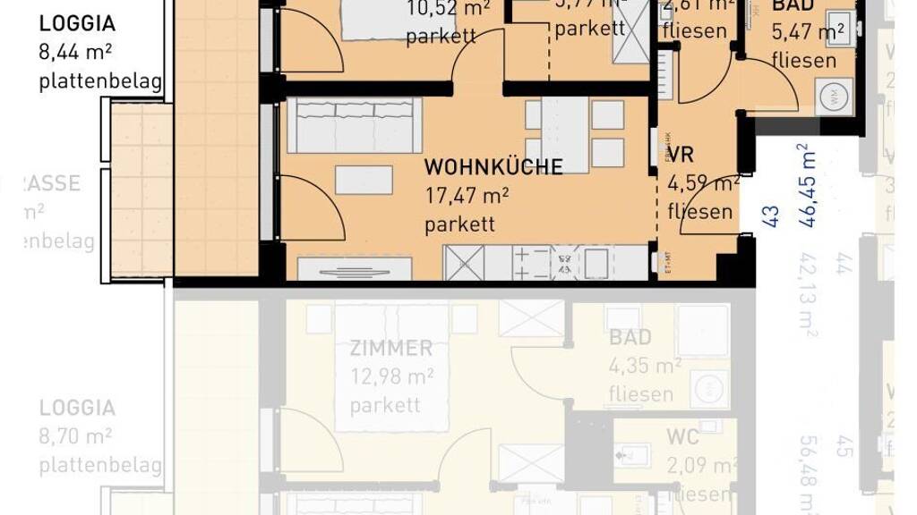 Sollten Sie mehr Platz benötigen, planen wir auch gerne eine größere Wohnung (zB eine 4-Zimmer-Wohnung anstelle von zwei nebeneinander liegenden 2-Zimmer-Wohnungen) für Sie. Fragen Sie einfach bei unserem Vertrieb nach!
