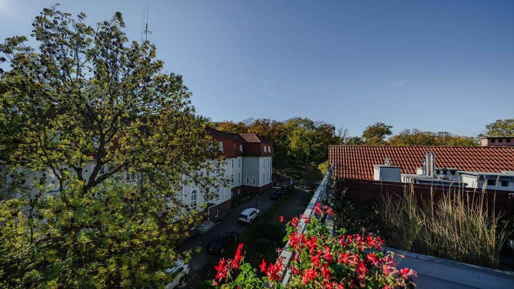 Im ersten Stock befindet sich ein heller Wohnraum mit offener Küche und Zugang zum Balkon, sowie ein Schlafzimmer, ein Badezimmer und ein Flur mit einem großen Schrank. Im Obergeschoss erwartet dich ein Schlafzimmer mit Platz für einen Kleiderschrank und Zugang zur Terrasse mit einer Fläche von 40 m² – der ideale Ort zum Entspannen, umgeben von Baumgrün.