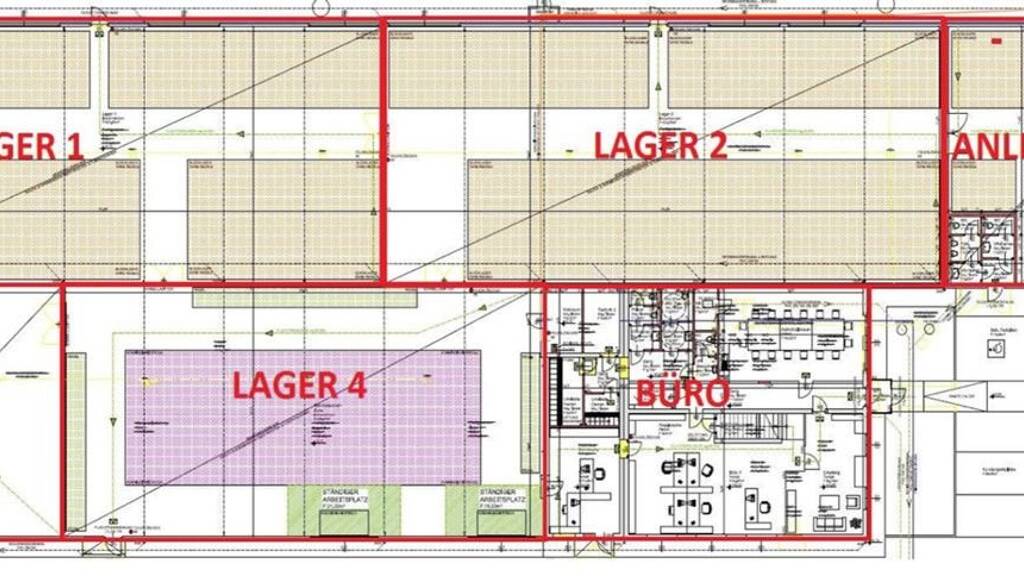 Die 5 Hallenabschnitte sind intern verbunden. Lager 4 kann auch zusa?tzlich direkt aus dem Bu?robereich erreicht werden. Insgesamt stehen 3 ebenerdige Rolltore zur Verfu?gung. Ein Tor befinden sich im Anlieferungsbereich, ein Tor bei Lager 1 und ein Tor bei Lager 3.