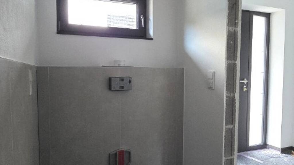 Nur wenige Stufen führen zur modernen Haustüre. Diese öffnend empfängt Sie eine kleine, helle Diele mit Platz für die Garderobe. Rechterhand befindet sich das kompakte Gäste-Bad mit bodengleicher Dusche. Dieses Bad wurde im gleichen modernen Style ausgestattet wie das 2. größere Badezimmer. Großformatiges Feinsteinzeug in dunklem Anthrazit zieren die Böden in den Fluren und Bädern, ebenso große Fliesen in warmem Beige, schmücken die Wände in den Badezimmern. Linkerhand befindet sich ein ca. 13 m² großer Raum, möglicherweise Ihr künfitges Büro oder auch Gästezimmer. Eine Treppe führt zu dem im Untergeschoss befindlichen Hauswirtschaftsraum. Hier entsteht Ihre Waschzentrale mit Stellplätzen für Waschmaschine und Trockner sowie weiterem Stauraum. Der ebenso im Untergeschoss befindliche Technikraum beherbergt sowohl die Stromverteilung als auch die hochmoderne und energieeffiziente Heiztechnik, eine Luft-Wärme-Pumpe und eine Lüftungsanlage mit Wäremerückgewinnung.