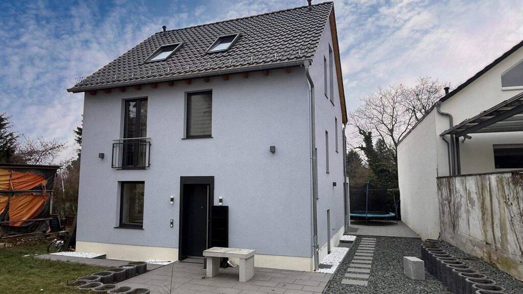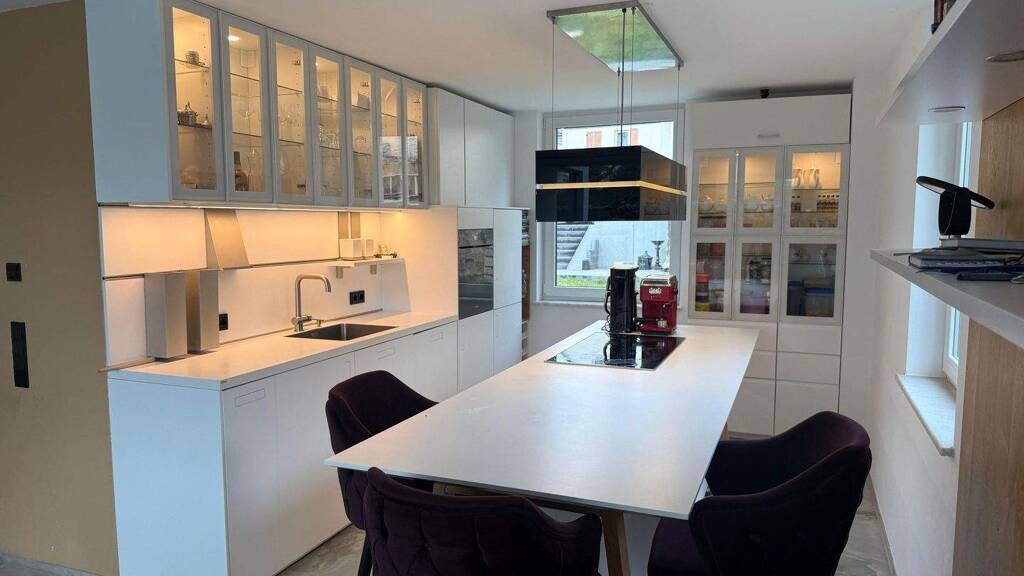 Diese hochwertig ausgestattete Terrassenwohnung verteilt sich auf drei Vollgeschosse wurde im Jahr 2022 errichtet und im Folgejahr fertiggestellt. Sie wohnen hier auf circa 213 qm Wohnfläche mit moderner Raumaufteilung und großzügigen Fensterflächen. Über den Eingangsbereich gelangen Sie in den geräumigen Wohn- /Essbereich mit angrenzender, offen gestalteter Küche. Diese verfügt über moderne Einbauelemente mit einer zentralen Kochinsel und integrierten Sitzmöglichkeiten. Vom Wohnbereich aus blicken Sie über die umfassend verglaste Front auf Ihre nach Südosten ausgerichtete Terrasse. Das Obergeschoss ist mit 2 Kinderzimmern ausgestattet, von denen eines über einen Zugang zu Ihrem Balkon mit unverbaubarem Weitblick ins Grüne verfügt. Der benachbarte Wintergarten wird aktuell als Gästezimmer genutzt. Das Badezimmer auf dieser Etage ist mit einer großen begehbaren Dusche und einem Bidet versehen. Im Dachgeschoss erwartet Sie der Elternschlafbereich mit einem Duschbad en suite. Die untere Etage hält einen Raum für die Haustechnik sowie einen praktischen Abstellraum für Sie bereit. Darüber hinaus profitieren Sie hier von einem vielseitig nutzbaren abgeschlossenen Bereich, der sich auf circa 40 qm erstreckt und ein eigenes Badezimmer beherbergt. Die komplette Wohnung wurde mit italienischen Marmorfliesen ausgelegt, die in Kombination mit der Fußbodenheizung ein angenehmes Wohnklima erzeugen. Diese Immobilie liegt energetisch unter dem Neubau-Standard und wird mittels Wärmepumpe beheizt. Das pflegeleichte Anwesen hält aktuell für Sie und Ihre Gäste drei PKW-Stellplätze bereit. Eine Baugenehmigung für ein Carport wurde bereits erteilt. Auch die Möglichkeit, alle Ebenen mit einem Aufzug zu verbinden, ist durch das geräumige Treppenhaus gegeben.