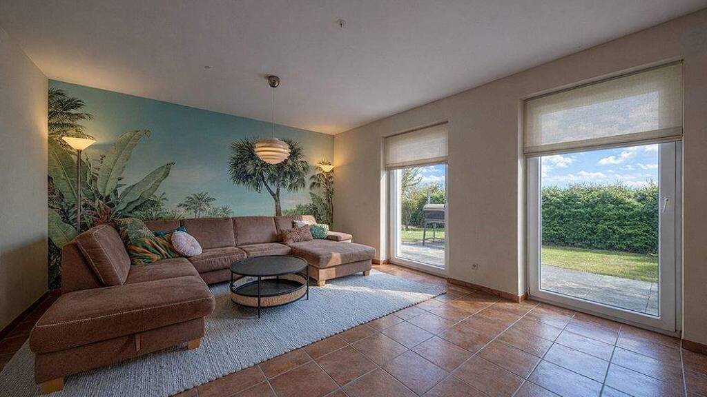 Im Erdgeschoss bildet der großzügige Wohn- und Essbereich das Herzstück des Hauses. Hier gehen Wohnen, Essen und Kochen fließend ineinander über und schaffen einen offenen Lebensmittelpunkt für die ganze Familie. Die integrierte Einbauküche fügt sich harmonisch in das Raumkonzept ein. Warme terrakottafarbene Fliesen verleihen den Räumen eine besonders gemütliche und einladende Wohnatmosphäre.