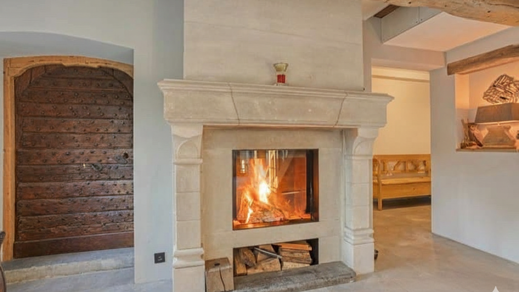 Wohnbereich: Designer-Luxusküche und ein großzügiges, hellerfülltes Wohnzimmer mit offenem Kamin.